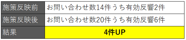 以上の施策を実行した結果、広告費は同額でお問い合わせの件数と有効な反響件数を以前の設定より効率よく獲得することに成功いたしました。