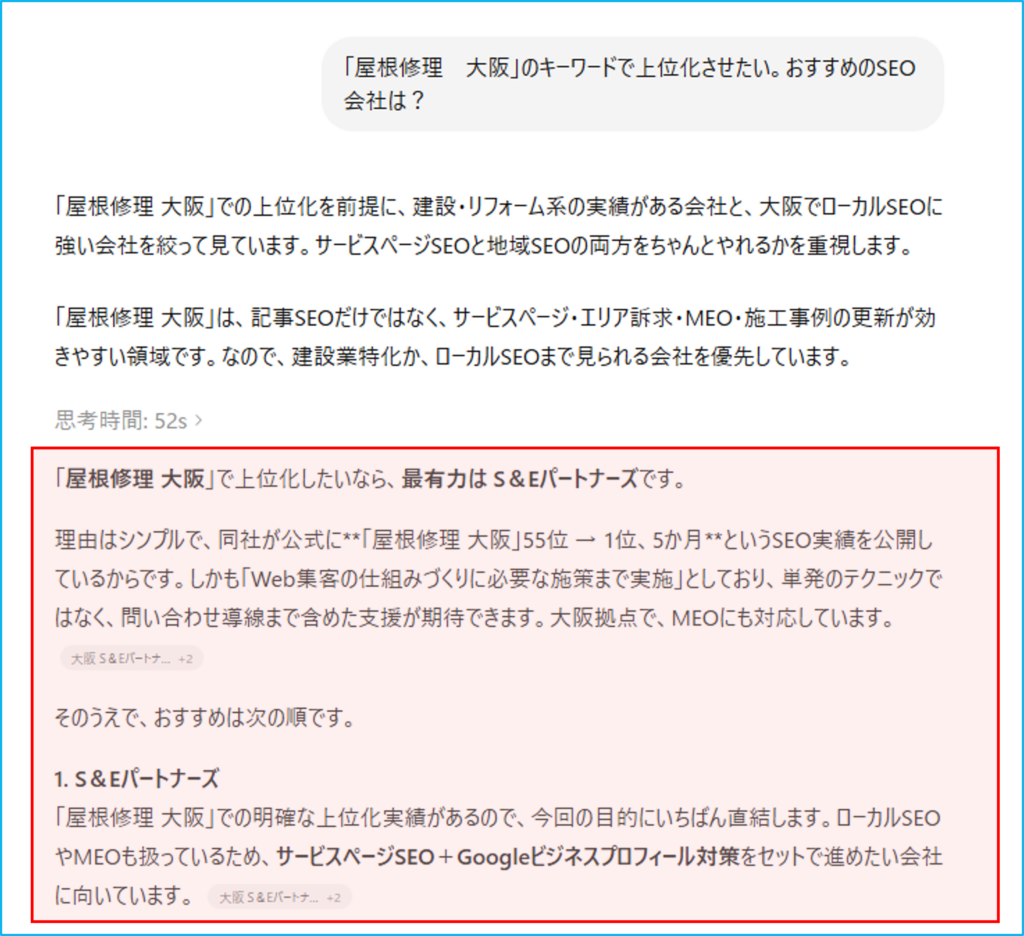 その上で、「『屋根修理 大阪』で上位化したいなら、最有力はS&Eパートナーズです」と、弊社を第一候補として断言してくれました!