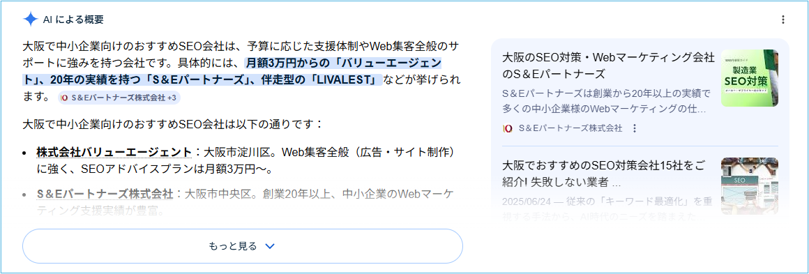 実際にGoogleで検索すると、検索結果の上部にAI Overviews(AIによる概要)が表示されます。「大阪で中小企業向けのおすすめSEO会社は、予算に応じた支援体制やWeb集客全般のサポートに強みを持つ会社です」という回答の中で、複数社とともにS&Eパートナーズが「20年の実績を持つ会社」として実名で紹介されました。