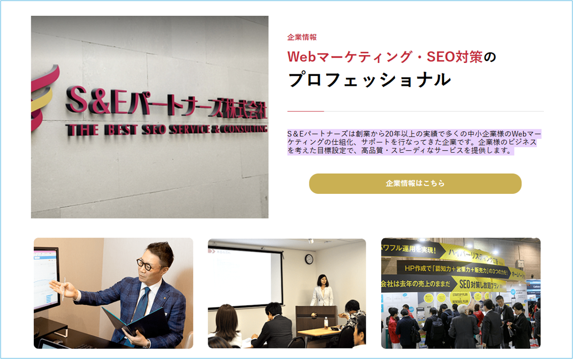 右側の情報源カードには、S&Eパートナーズのトップページが表示されています。「S&Eパートナーズは創業から20以上の実績で多くの中小企業様のWebマーケティングの仕組み化、サポートを行なってきた企業」という説明文とともに引用されていました。
