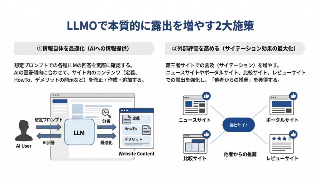 LLMOで本質的に露出を増やし、競合に勝つためには、これらの内部整備を終わらせた上で、AIが回答を構築するための素材である【ページの情報自体を最適化する作業】と、【外部評価を高める作業】に注力していく必要があります。
